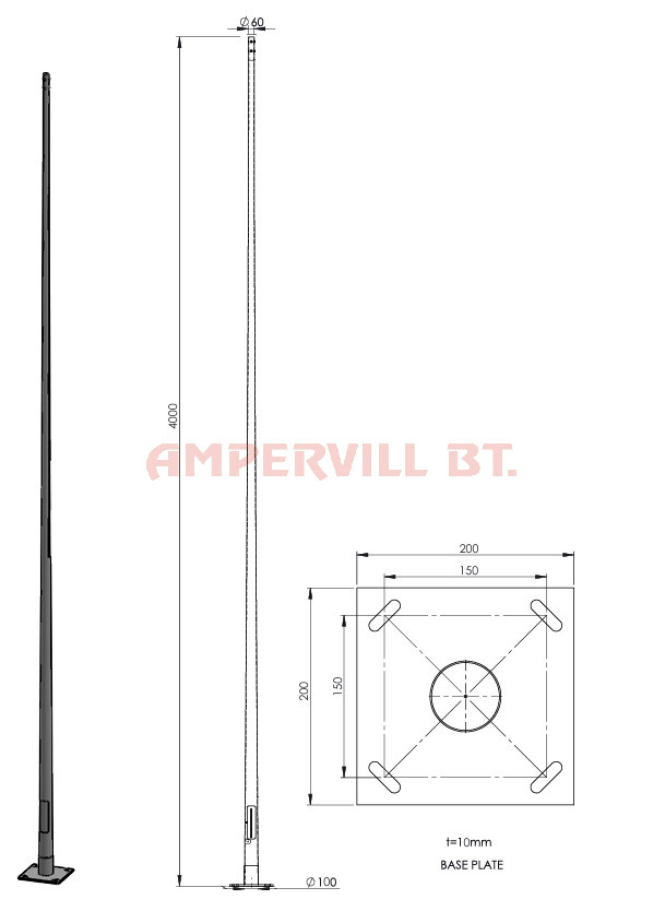 LÁMPAOSZLOP IS-HO-K-60/40/3 Horg.Acél 4m talplemezes